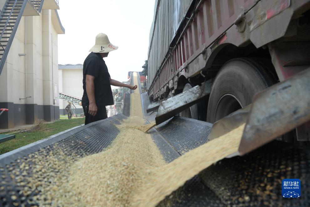 在江西省南昌縣橫崗國家糧食儲備庫,種糧大戶開倉卸載糧車上的早稻(8月8日攝)。