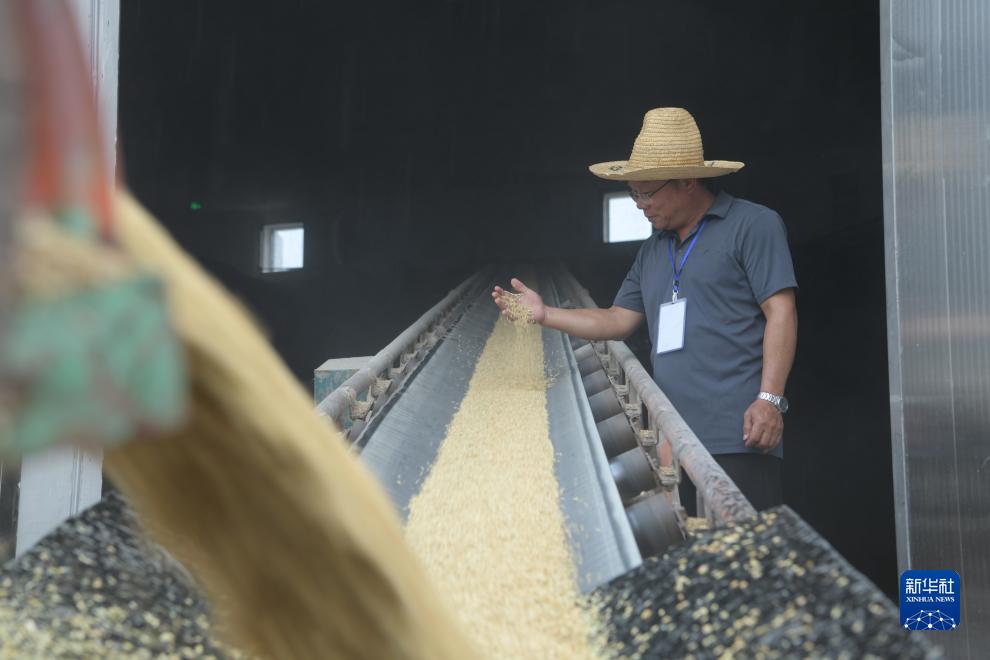 在江西省南昌縣橫崗國家糧食儲備庫,工作人員在查看早稻的情況(8月8日攝)。