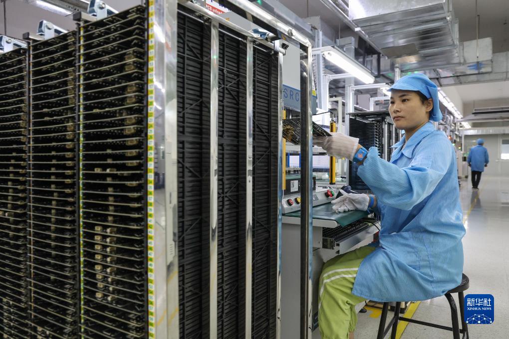 質檢員在佛山照明高明生産基地的車燈生産車間檢測産品(8月9日攝)。