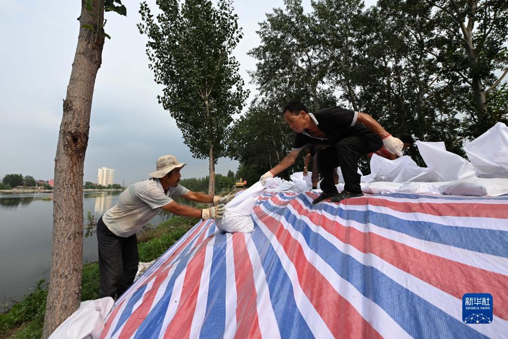 8月10日,在天津市靜海區大清河&頭段南堤,抗洪人員在加固堤壩。