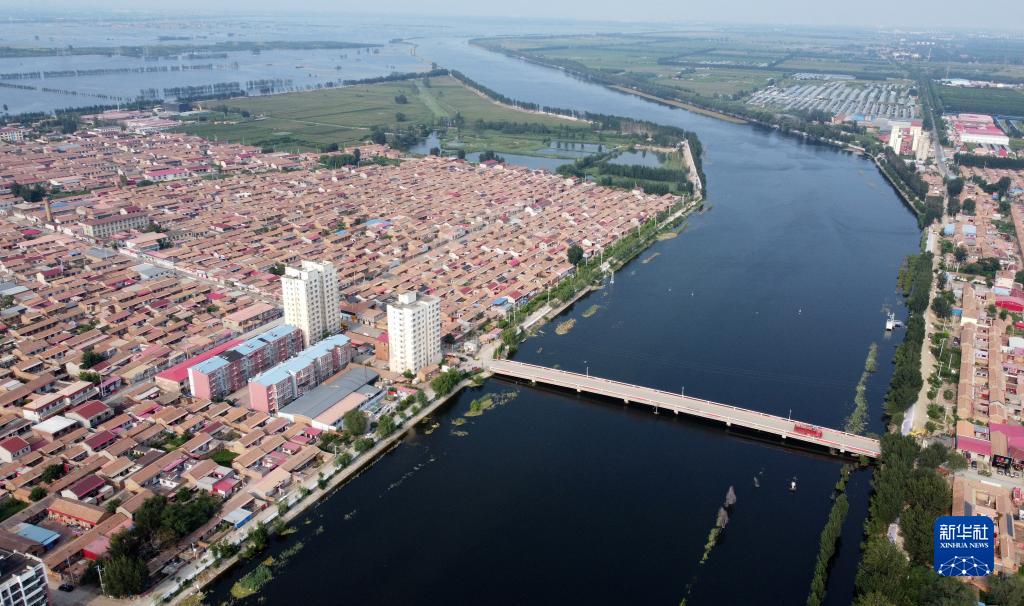 這是8月10日拍攝的大清河及堤北村莊(無人機照片)。