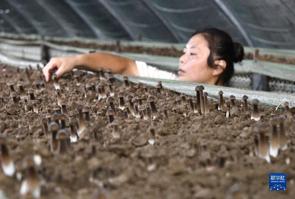 8月10日,在山東省菏澤市定陶區一處食用菌種植基地,工作人員在收穫成熟的黑皮雞樅菌。