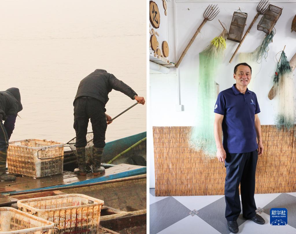 拼版照片:左圖為湖南省岳陽縣漁民周界武(右)在洞庭湖上打漁(資料照片);右圖為2023年7月9日,退捕後擔任岳陽縣東洞庭湖漁政監察執法局護漁員的周界武在岳陽縣麻塘漁民新村漁民驛站留影(新華社記者 金立旺 攝)。