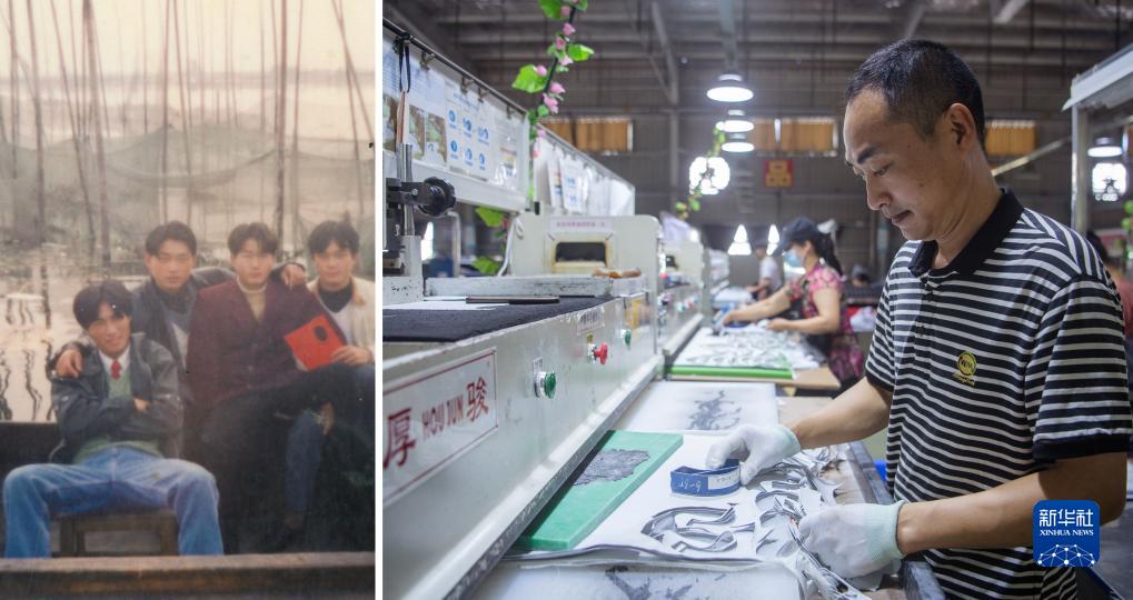 拼版照片:左圖為1998年,湖北洪湖漁民陳玉祥(左一)與朋友在船上(資料照片);右圖為2023年7月21日,陳玉祥在湖北洪湖一家鞋業公司工作(新華社記者 伍志尊 攝)。