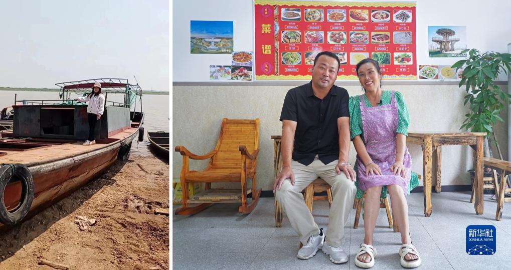 拼版照片:左圖為2020年3月20日,江西省九江市永修縣吳城鎮退捕漁民何桂花與自家漁船合影留念(資料照片);右圖為2023年7月16日,何桂花和丈夫徐禮淵在自家開的餐館裏留影(新華社記者 萬象 攝)。
