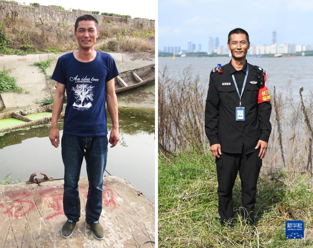 拼版照片:左圖為2016年,江蘇省南京市浦口區漁民楊金海在漁船上留影(資料照片);右圖為2023年7月18日,楊金海在浦口區的長江邊留影(新華社記者 季春鵬 攝)。