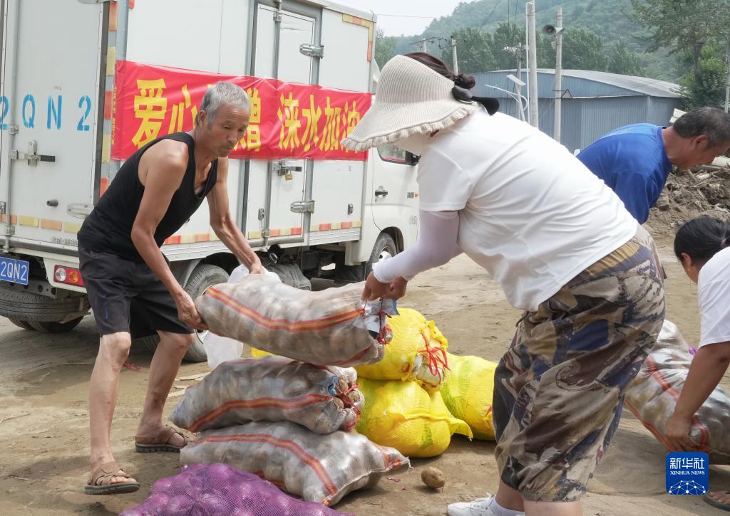 8月10日,淶水縣趙各莊鎮李各莊村的村民在搬運愛心人士捐贈的蔬菜。