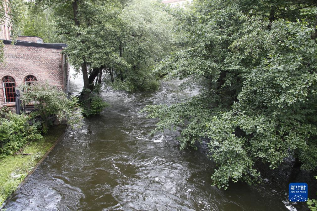 這是8月10日拍攝的位於挪威首都奧斯陸市區的阿克河。挪威水利部門數據顯示,由於近期強降雨引發的洪水,阿克河流量增至平時的10倍以上。