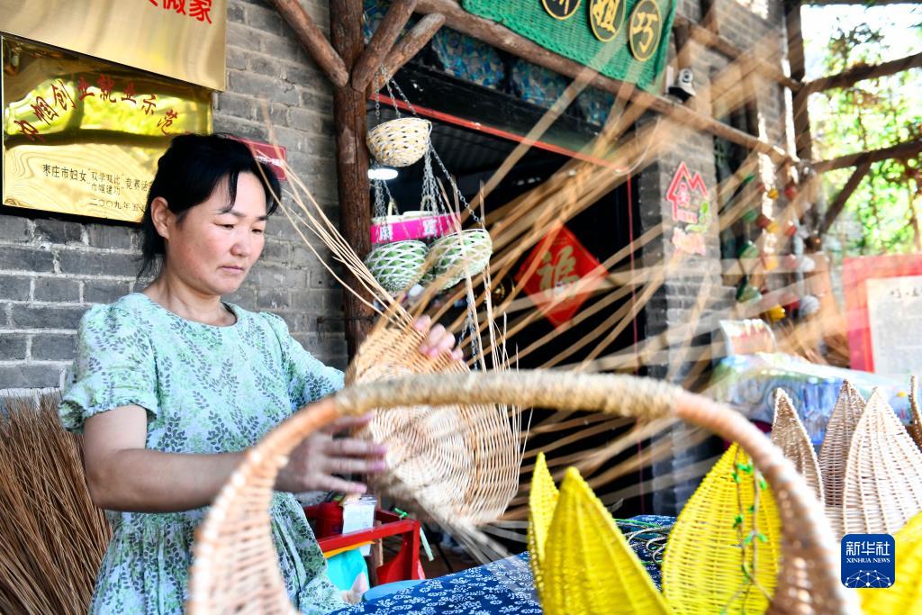 8月10日,在棗莊市薛城區柳編非遺工坊,非遺傳承人趙秀梅在製作柳編。