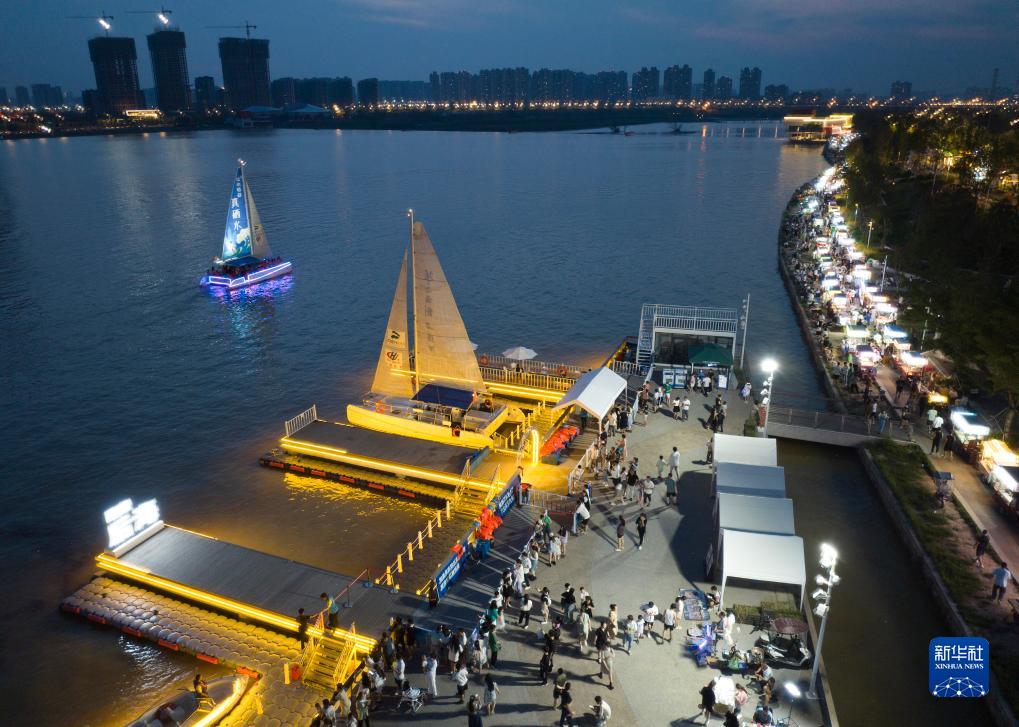 游人在西安市浐灞生態區一處遊船碼頭和後備箱集市上游覽(8月10日攝,無人機照片)。
