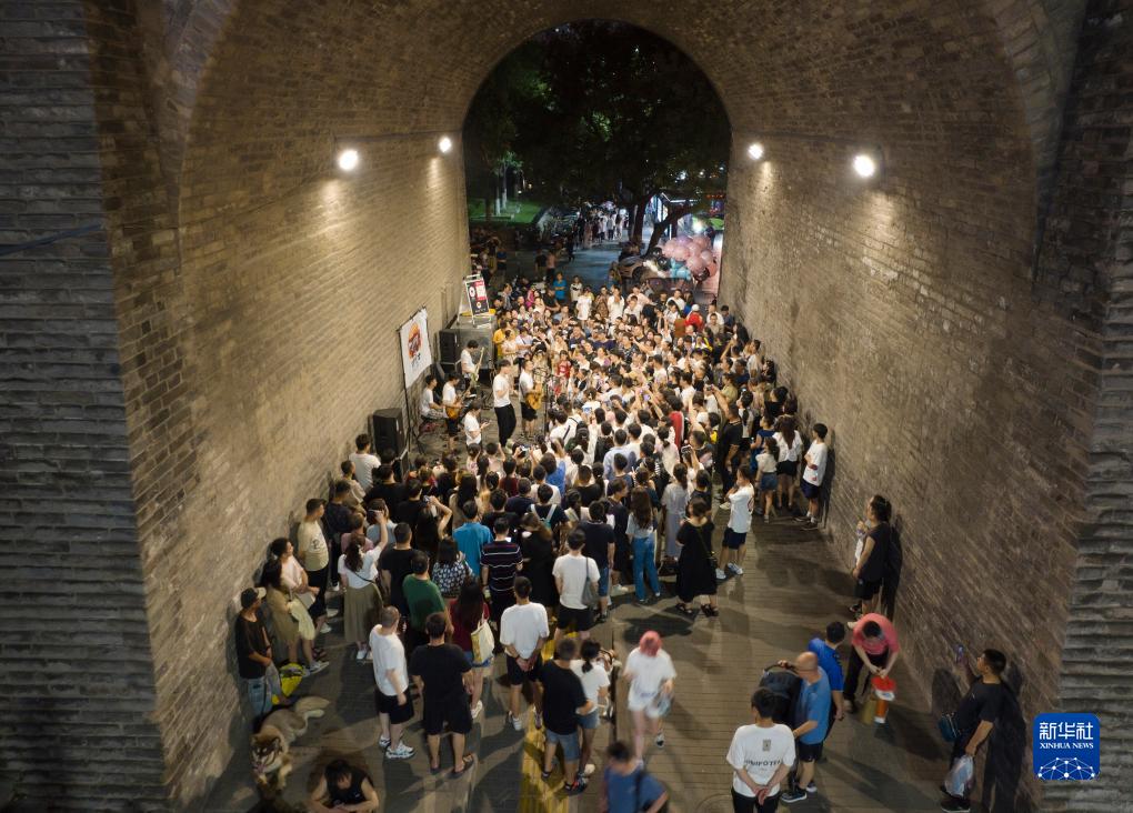 在西安城墻南門下,市民、游客在觀賞樂隊表演(8月10日攝,無人機照片)。