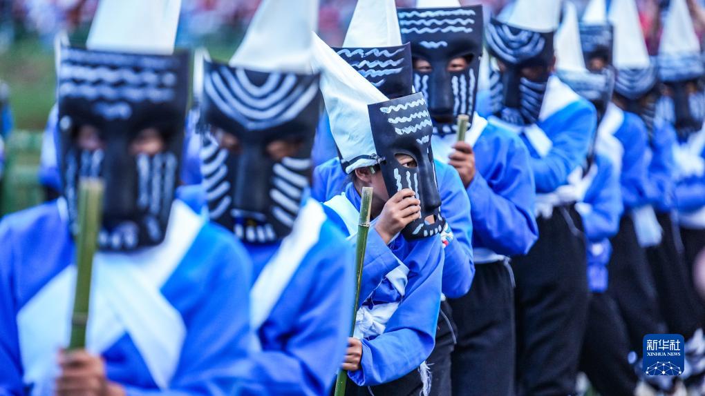 小朋友在火把節活動上表演彝族傳統戲劇“撮泰吉”(8月10日攝)。
