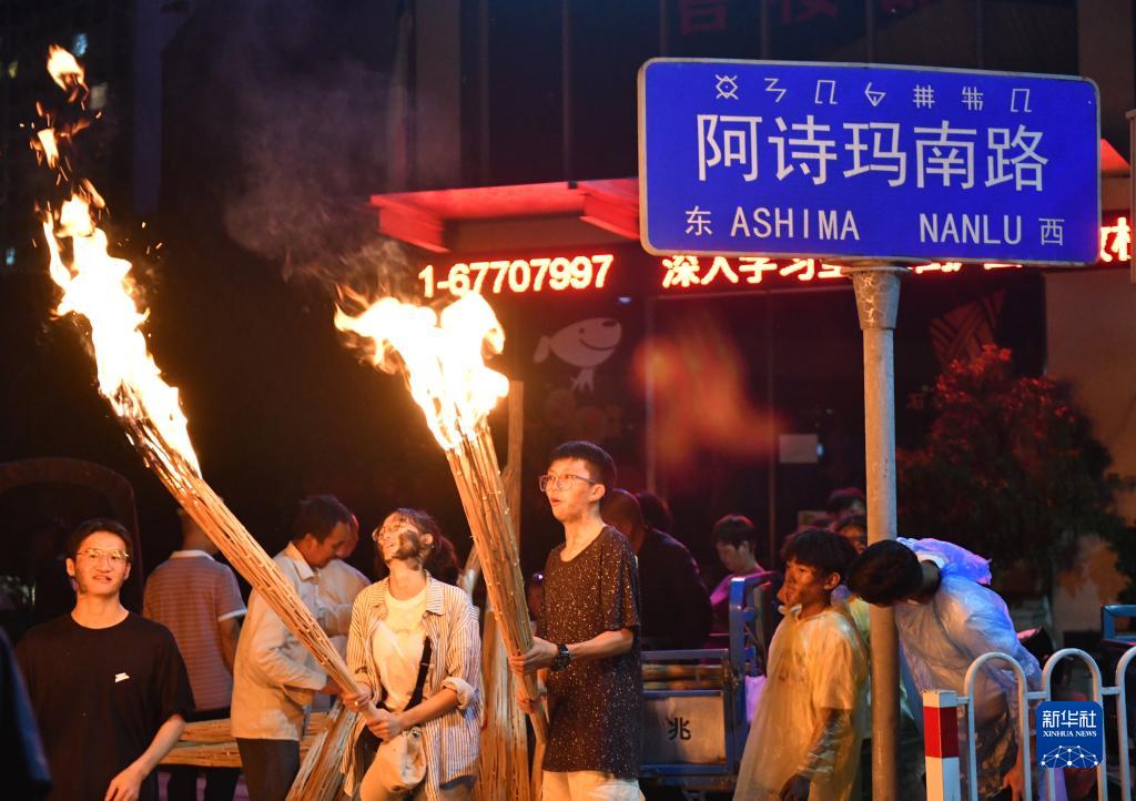 8月10日晚,兩名年輕人舉着火把在歡慶火把節。