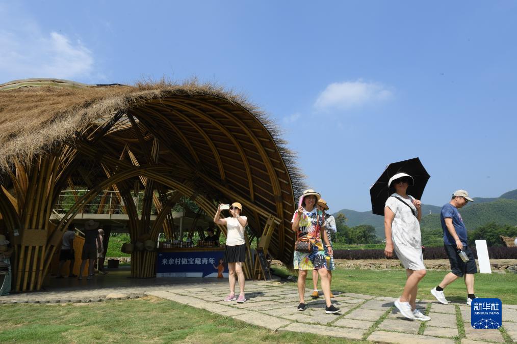 8月11日,游客在安吉余村參觀用當地盛産的竹材料建造的建築。