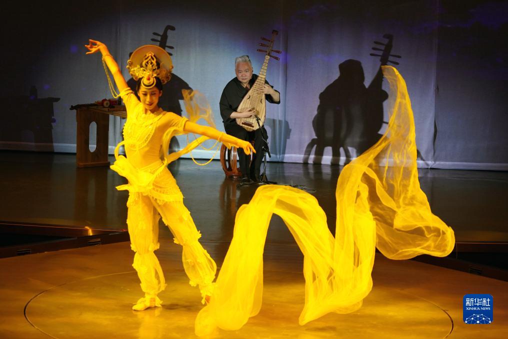 8月9日,在《樂動敦煌》演出現場,敦煌古樂全球推廣大使、國樂藝術家方錦龍演奏琵琶,為舞蹈演員伴奏。