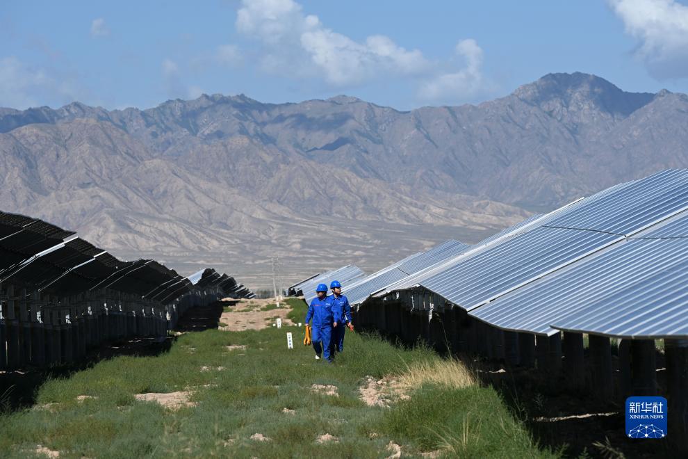 8月11日,工作人員在中國能建張掖甘州南灘30萬千瓦光伏發電項目巡檢。