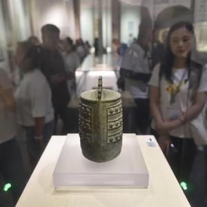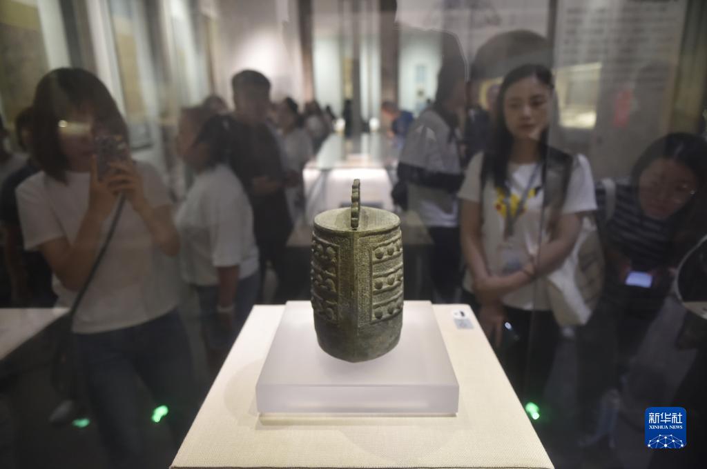 8月9日,觀眾在河南省開封市博物館裏參觀“大晟夷則”銅編鐘。