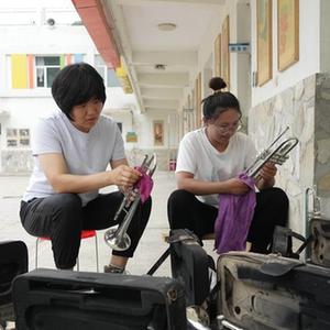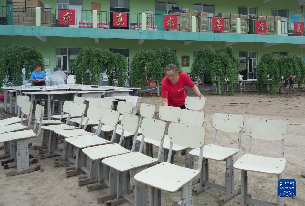 8月11日,在河北省淶水縣其中口鄉,學校老師在擦洗桌椅。
