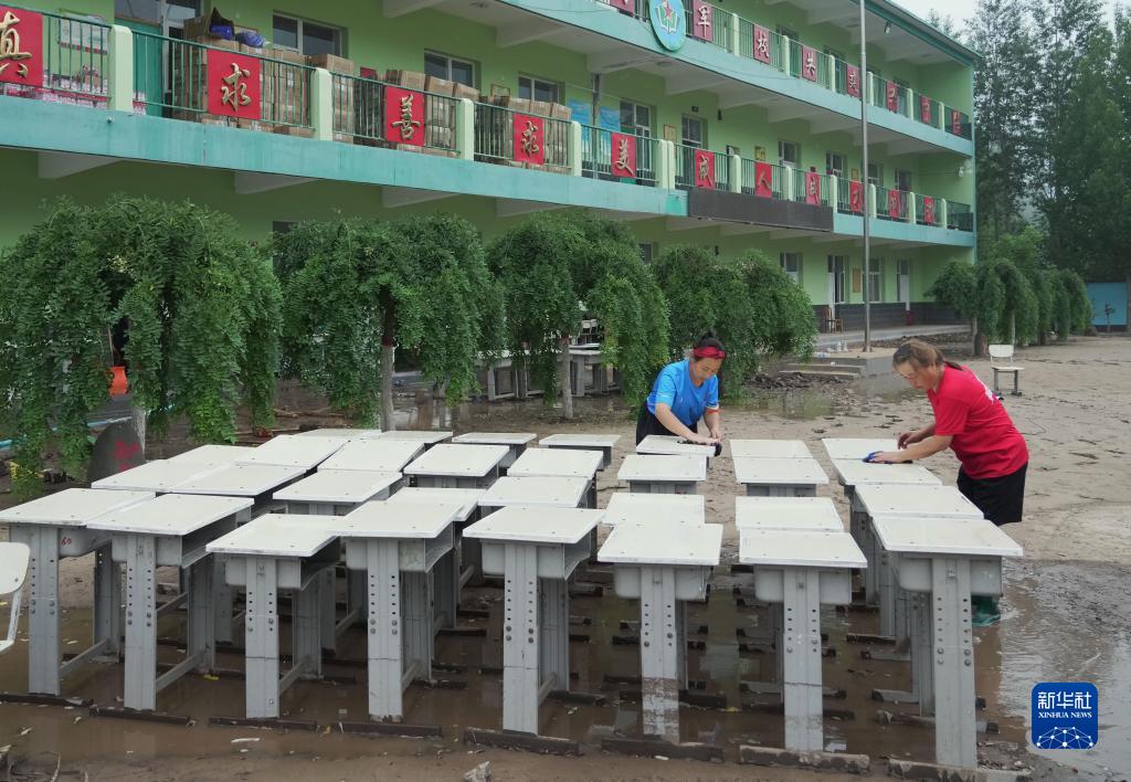 8月11日,在河北省淶水縣其中口鄉,學校老師在擦洗課桌。