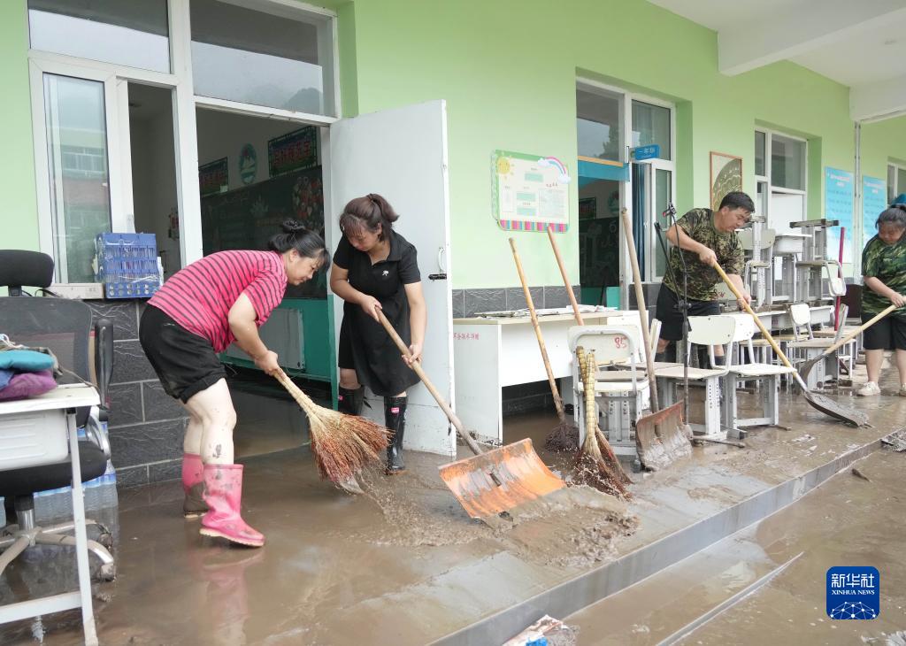 8月11日,在河北省淶水縣其中口鄉,學校老師在清洗教室。