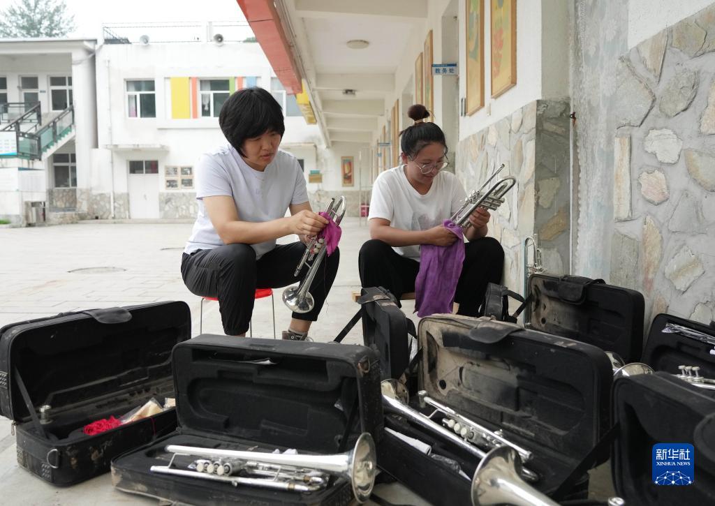 8月11日,在河北省淶水縣龍門鄉,學校老師在擦拭樂器。