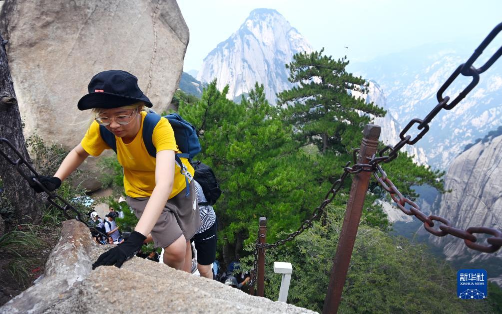 游客在華山北峰攀爬游覽(8月10日攝)。
