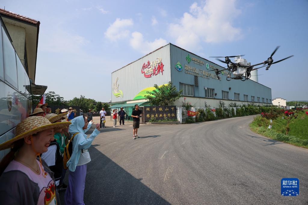 8月11日,在吳興區道場鄉錢山下糧油專業合作社,小朋友在了解植保無人機的工作原理。