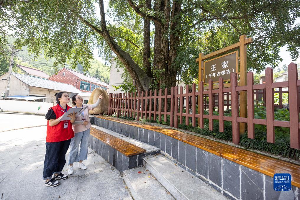 8月10日,在浙江省湖州市長興縣和平鎮周塢山村,志願者在巡查古樹的生長和保護情況。