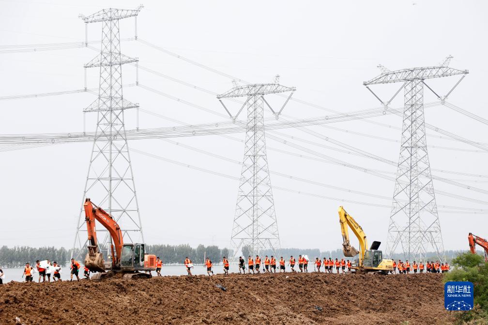 8月11日,武警第一機動總隊某支隊官兵在堤壩上轉運沙袋。