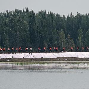 在天津市靜海區王口鎮千里堤、茁頭排幹西堤加固搶險一線,武警第一機動總隊官兵爭分奪秒加固涉險堤壩,切實維護群眾生命安全。