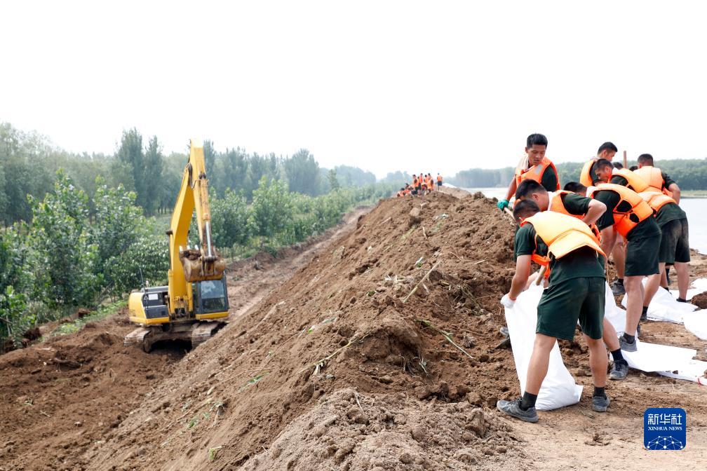 8月11日,武警第一機動總隊某支隊官兵在裝填用於加固堤壩的沙袋。