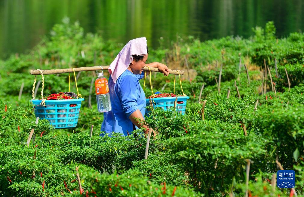 8月11日,在貴州省黔東南苗族侗族自治州從江縣下江鎮平江村辣椒種植基地,村民在挑運辣椒。