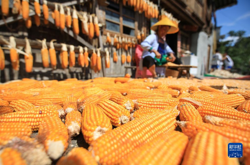 8月11日,在貴州省黔東南苗族侗族自治州從江縣往洞鎮增衝村,村民在晾曬玉米。