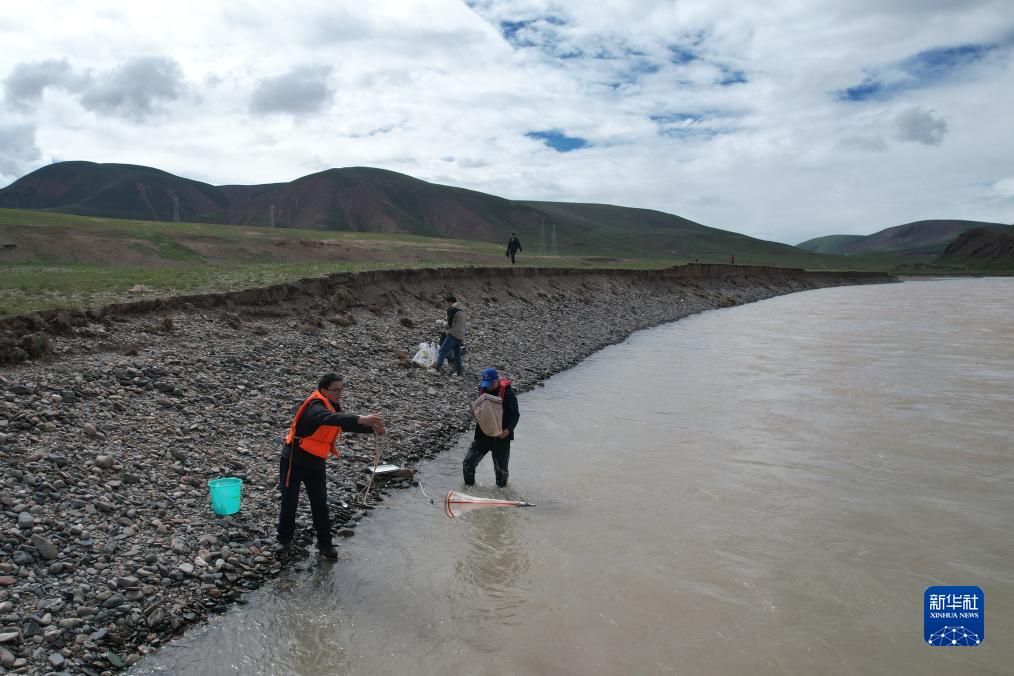 科考隊員在長江源辮狀河道進行科考作業(7月26日攝)。