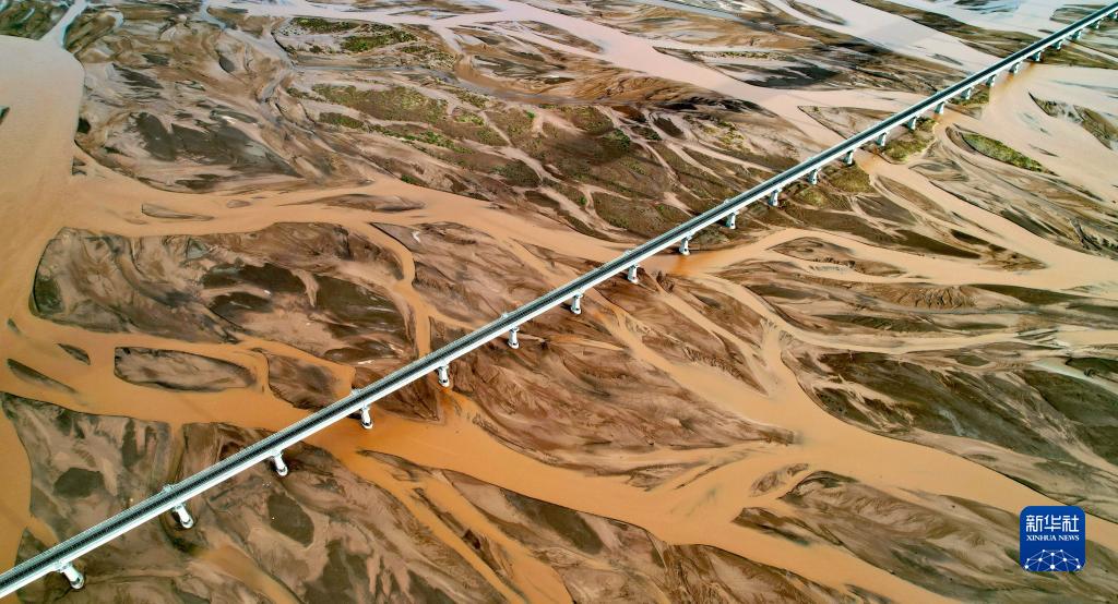 青藏鐵路跨過沱沱河的辮狀河道(7月26日攝,無人機照片)。