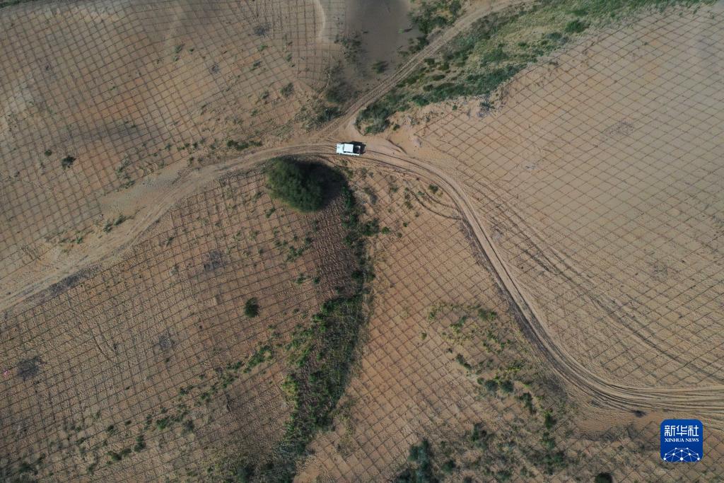 8月11日,運載沙障原材料——沙柳條的車輛在達拉特旗境內的庫布其沙漠中行駛(無人機照片)。