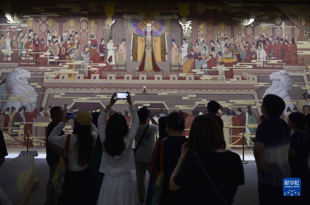 8月11日晚,游人在洛陽應天門遺址博物館內觀賞壁畫。