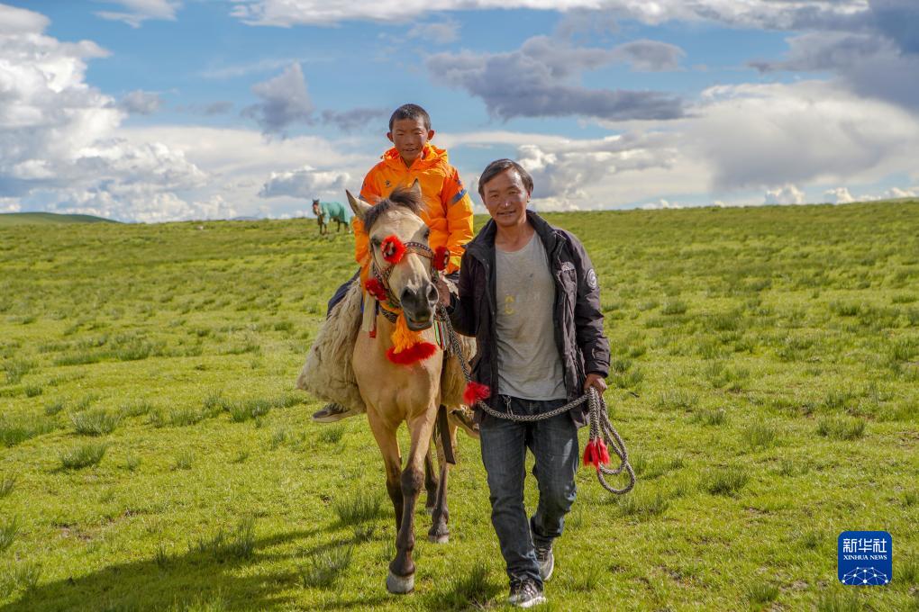 列熱覺旦騎着馬,他的父親次扎達牽着馬行走在草原上(8月9日攝)。