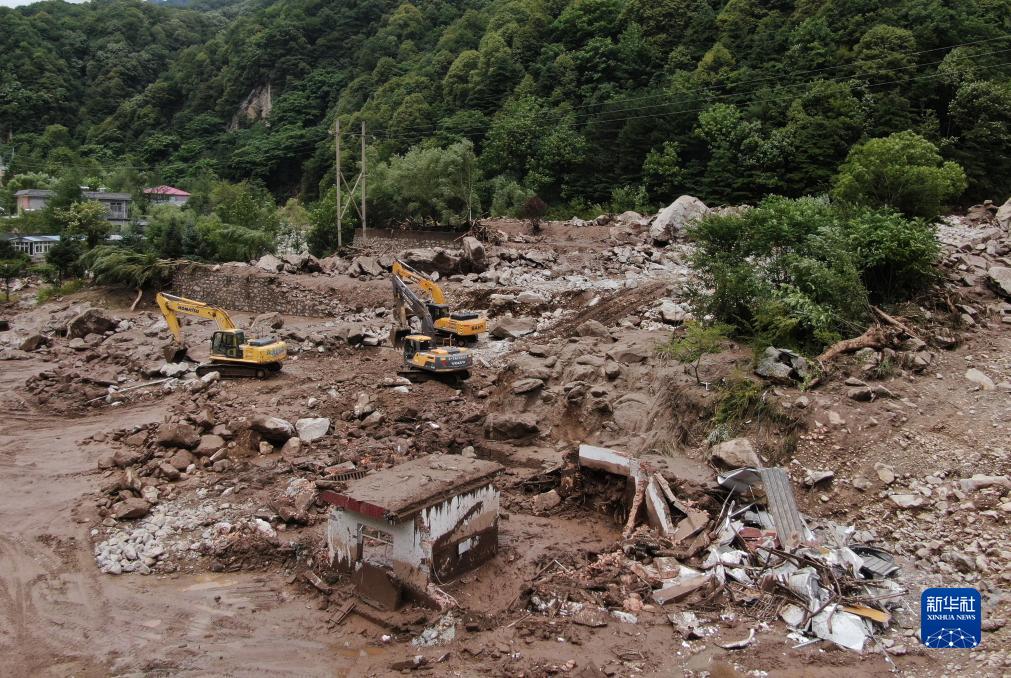 這是8月12日拍攝的西安市長安區灤鎮街道喂子坪村雞窩子組山洪泥石流災害現場(無人機照片)。
