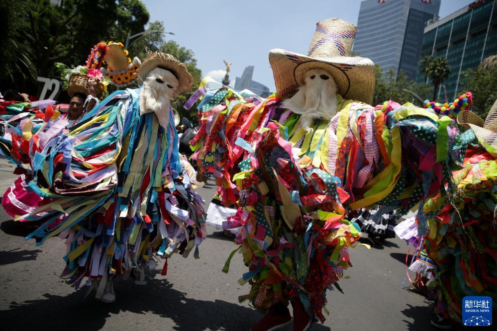 8月9日,在墨西哥首都墨西哥城,演員身着傳統服飾參加世界土著人民國際日慶祝活動。