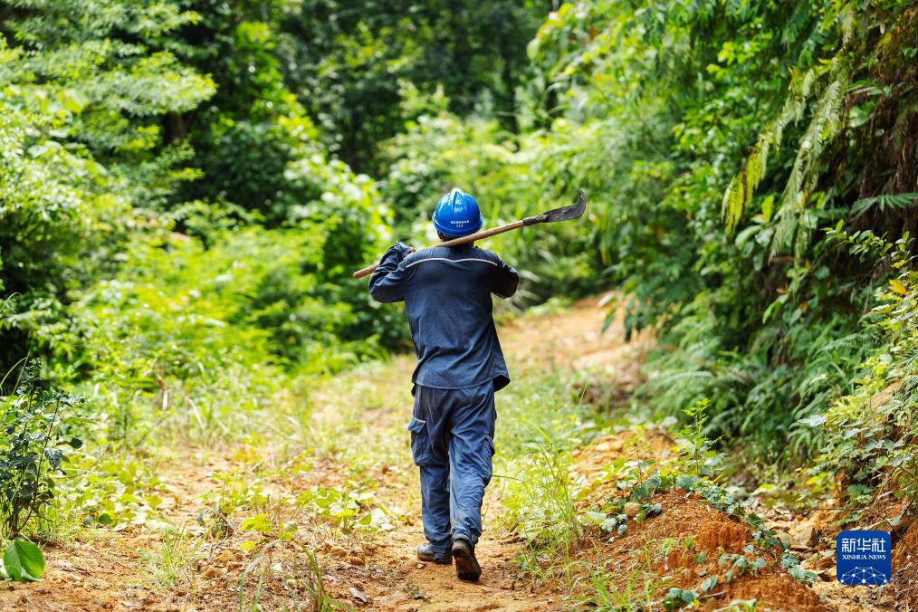 8月10日,對10千伏浦寨Ⅱ線19號塔的巡視結束後,渾身濕透的溫賢文扛着大砍刀走在山路上。新華社記者 費茂華 攝