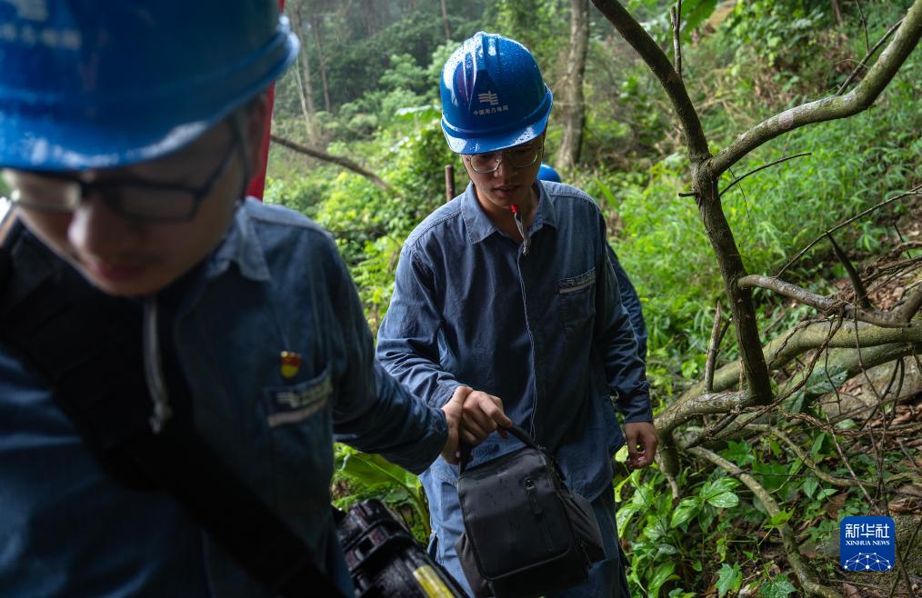 8月10日,姚證強(左)和李英興手拉着手經過濕滑路段。新華社記者 費茂華 攝