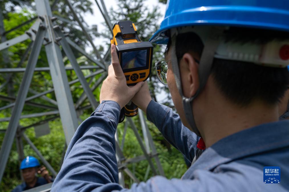 8月10日,李英興用紅外成像測溫儀對桿塔進行測溫。新華社記者 費茂華 攝