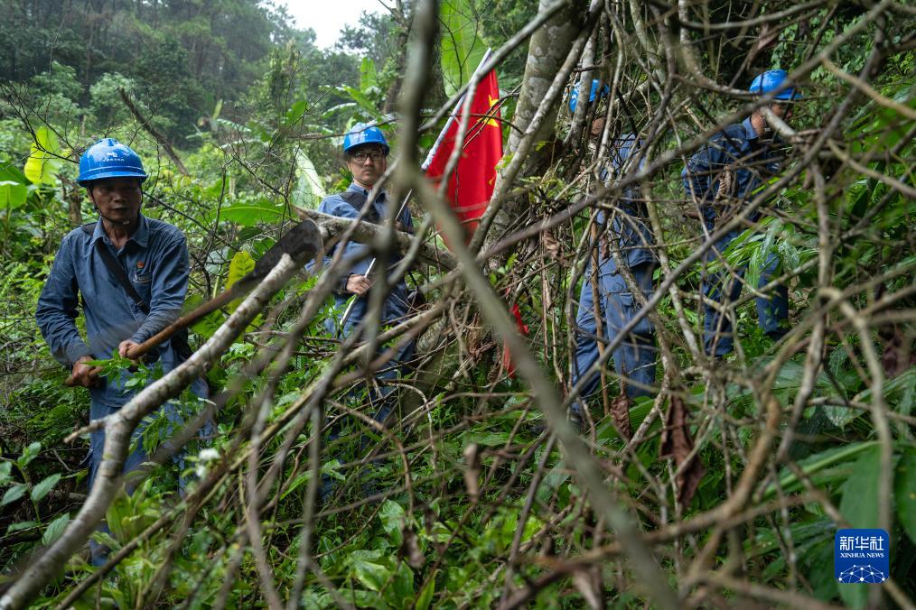 8月10日,溫賢文(左一)用砍刀清理一棵倒伏在山路上的樹木。新華社記者 費茂華 攝
