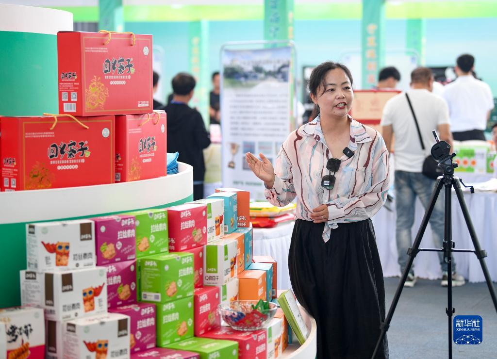 8月12日,一名網絡主播在展銷會上介紹産品。