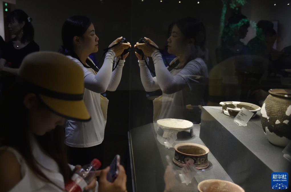 8月8日,參加集中採訪的媒體記者在位於河南省鄭州市的大河村遺址博物館參觀拍照。
