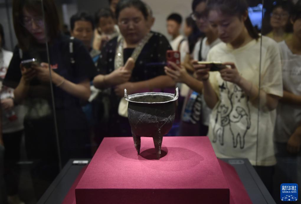 8月12日,觀眾在位於河南省洛陽市偃師區的二里頭夏都遺址博物館參觀網格紋銅鼎。