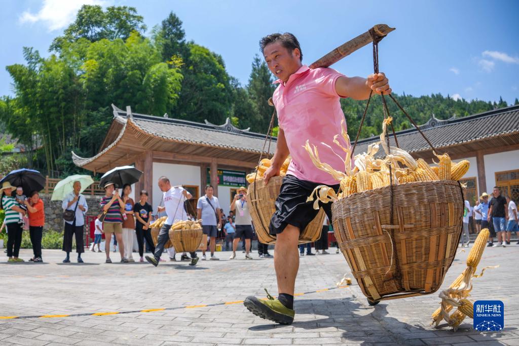 8月12日,村民在宣恩縣椒園鎮黃坪村的景區趣味運動會上參加挑玉米比賽。