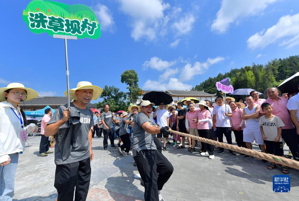 8月12日,人們在宣恩縣椒園鎮黃坪村的景區趣味運動會上參加拔河比賽。