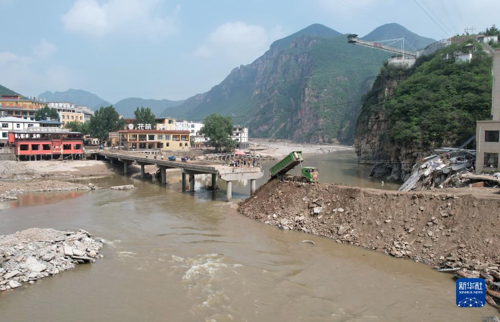 8月9日,工人操作機械設備搶修通往淶水縣三坡鎮劉家河村的橋梁(無人機照片)。